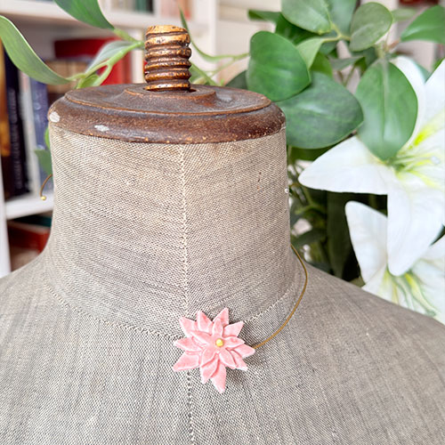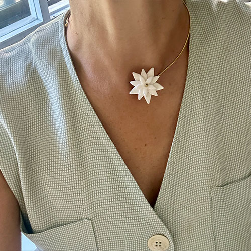 Este choker delicado combina un diseño abierto con una pequeña flor de jazmín en cerámica modelada a mano. Su tamaño ligero y su acabado artesanal lo hacen perfecto para llevarlo solo o combinarlo con otros collares, aportando un toque natural y femenino a cualquier look.