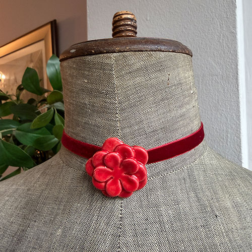 Collar de terciopelo con charm floral de cerámica artesanal.